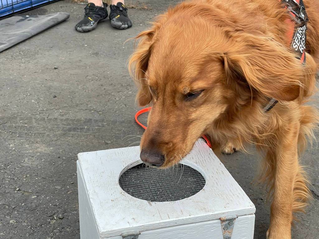 West Coast Search Dogs cadaver dog Duey locates a box with a tracking scent during the county’s Emergency Preparedness Expo on July 22. (Michael S. Lockett / The Daily World)