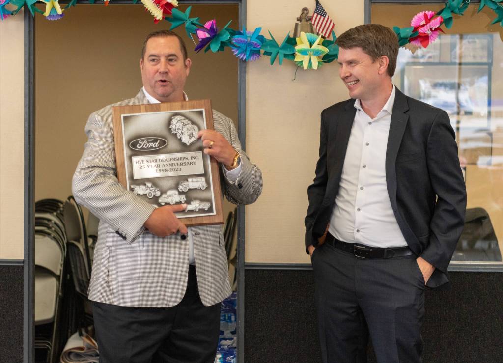 Rich Hartman, left Five Star dealerships owner holds a 25-year anniversary plaque, accompanied by Ford Regional Manager Steven Kettler, during a celebration on Monday, Aug. 28 at the dealership's east Aberdeen location. (Alicia Tisdale / Five Star Dealerships)