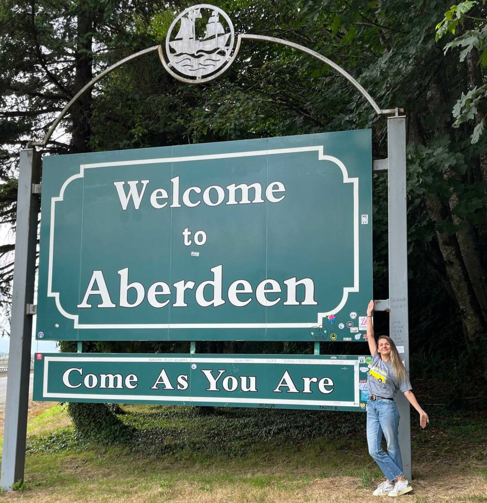 A friend captures Zoé Roux’s spirit at the “Welcome to Aberdeen” sign. Roux, who studied as a junior at Aberdeen High School during the 2015-16 school year as part of the Aberdeen Rotary Club’s Long-Term Exchange Program, shows the positive energy she exudes in a recent visit back to Grays Harbor.