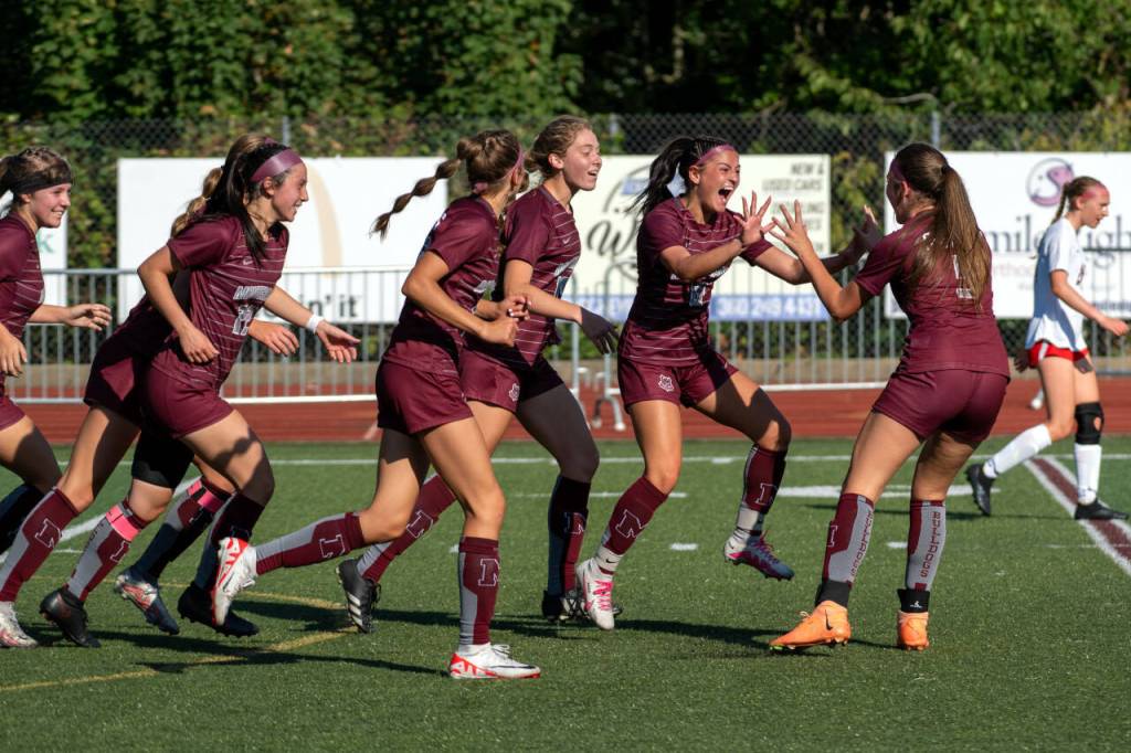 PHOTO BY FOREST WORGUM Montesano forward Adda Potts, second from right, is congratulated by teammate Sam Roundtree (5) after scoring a goal in the first half of a 2-1 victory over Seattle Academy on Saturday in Montesano. The Bulldogs would secure the victory in a penalty-kick shootout 4-2.