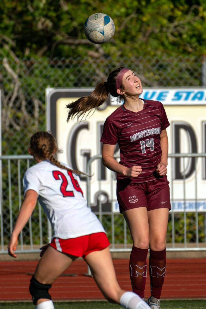 PHOTO BY FOREST WORGUM Montesano midfielder Ava Schrader (14) heads the ball during a 2-1 victory (4-2 on penalty kicks) over Seattle Academy on Saturday in Montesano.