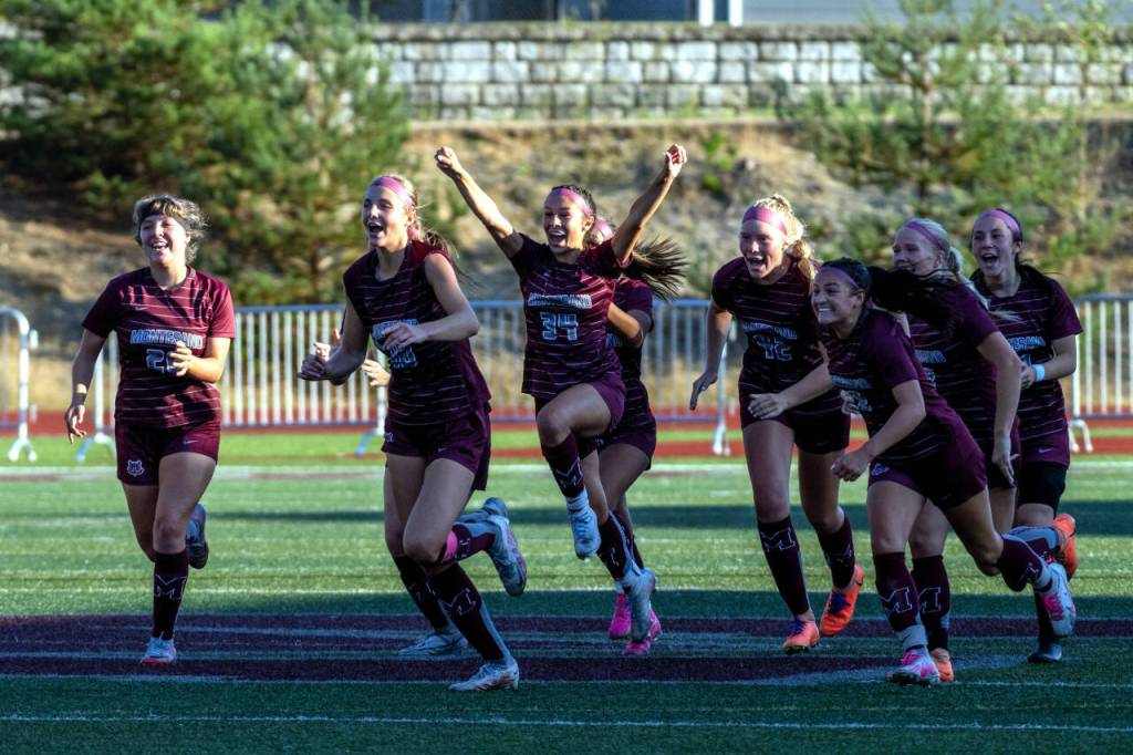 The Montesano girls soccer team celebrates after defeating Seattle Academy 2-1 (4-2 on penalty kicks) in a non-league game on Saturday at Jack Rottle Field in Montesano.