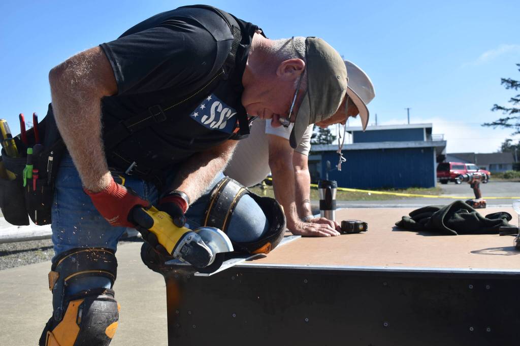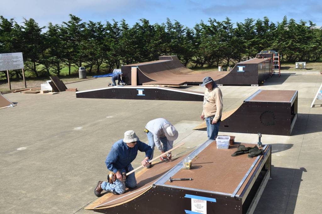 From left: Jim Golden, Bob Rhoades, Sylvia Schroll, Ed Schroll and Richard Wills work to construct new ramps at the Ocean Shores Skatepark on Friday, Sept. 7.