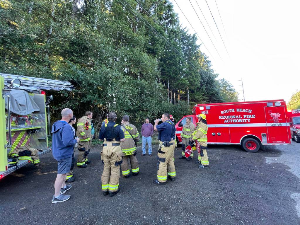 Firefighters from the South Beach Regional Fire Authority debrief after a fire Thursday morning.