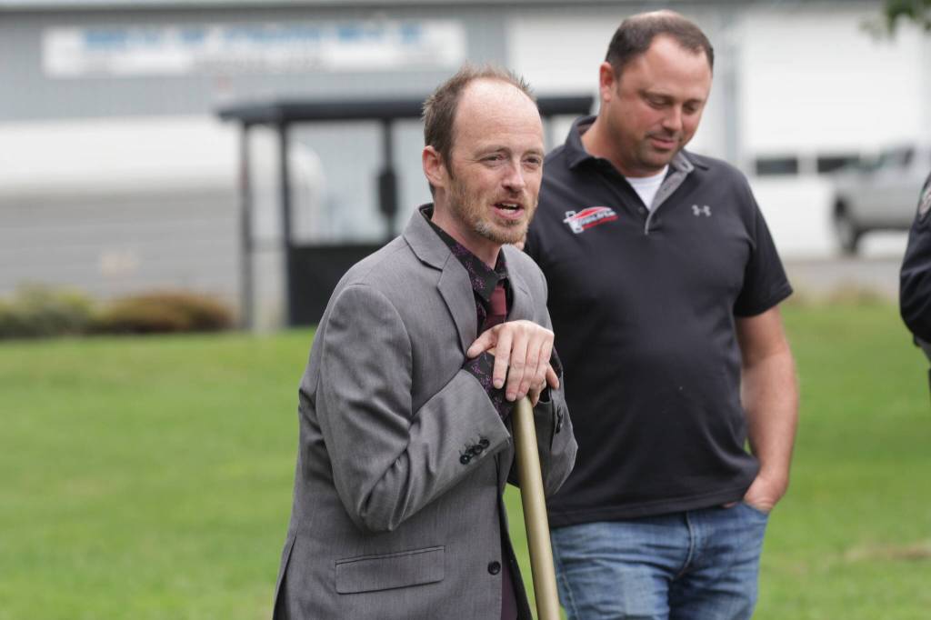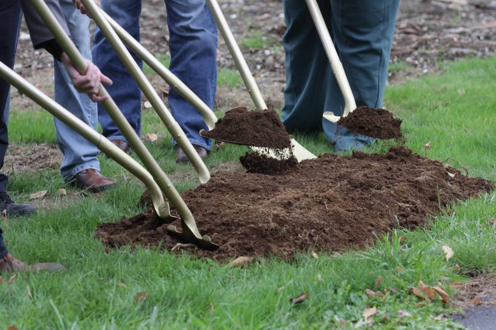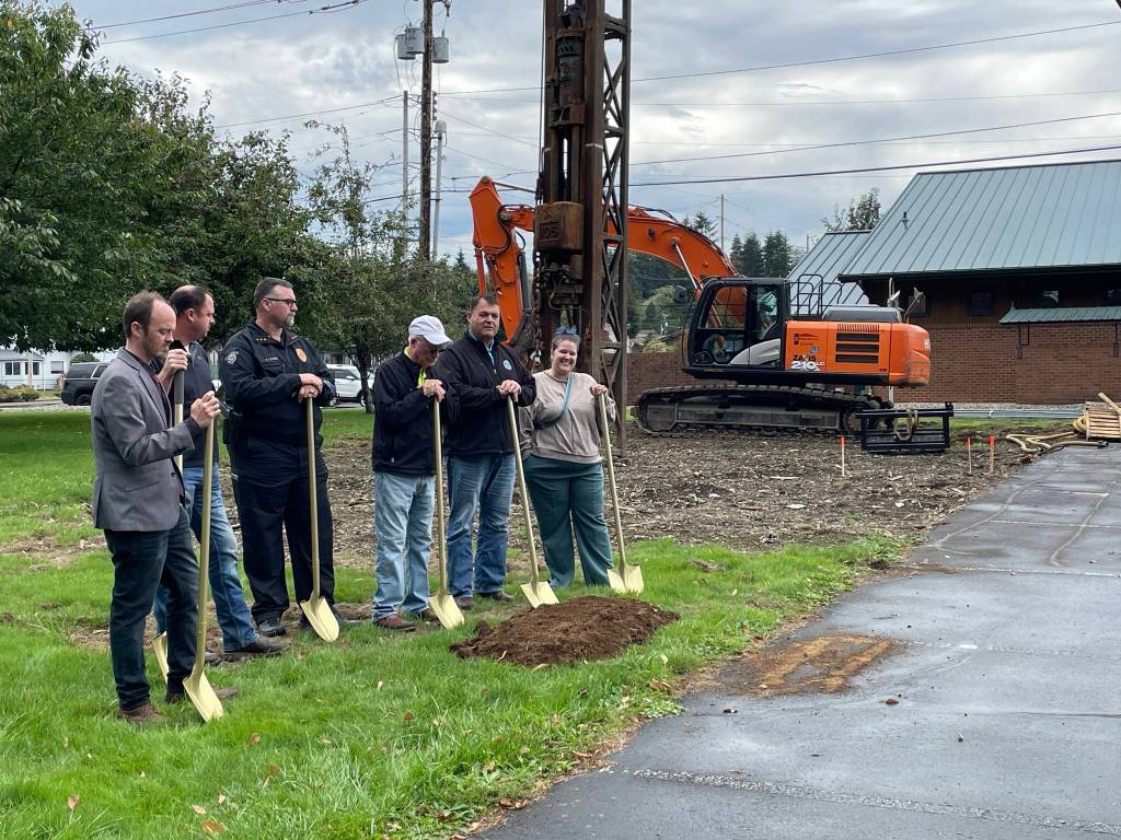 With a flourish of a gold-painted shovel, Cosmopolis Mayor Kyle Pauley, former Mayor Frank Chestnut and other officials broke ground on the new city municipal building on Friday afternoon.