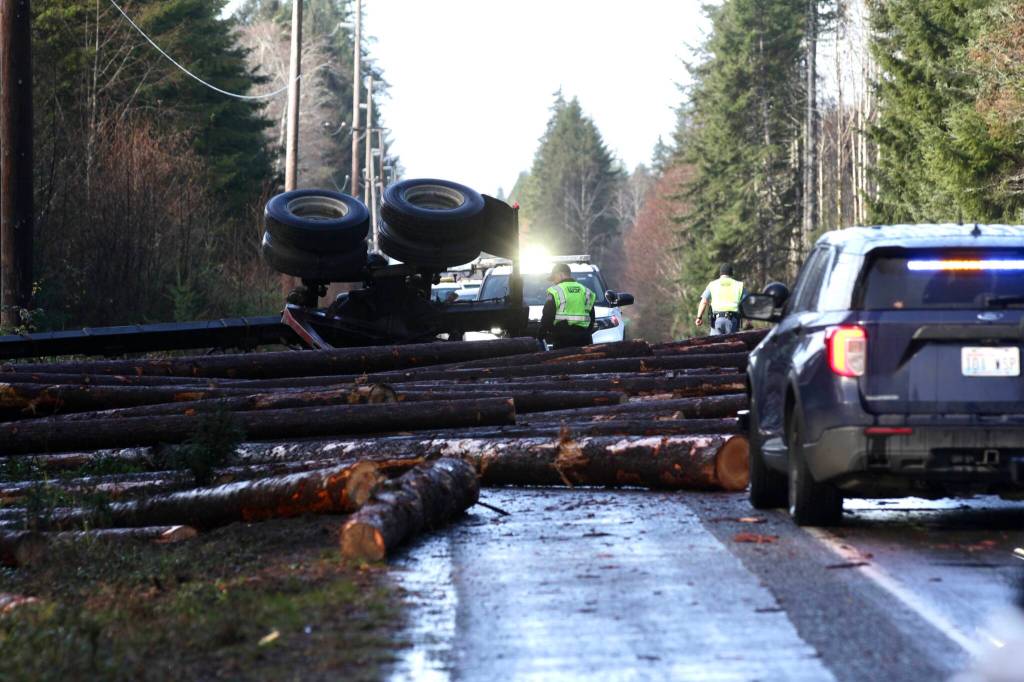 Both vehicles came to rest in the west side of the road, with logs spilled around the area. The road was closed partially and completely for periods during the response and subsequent investigation.