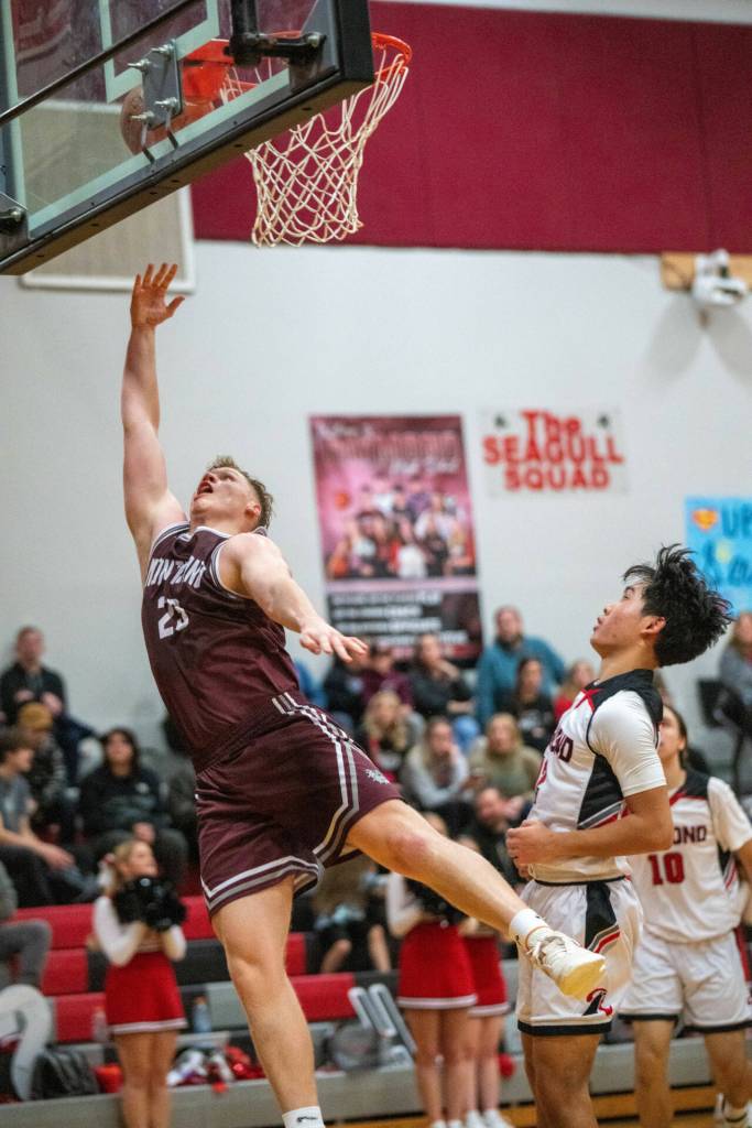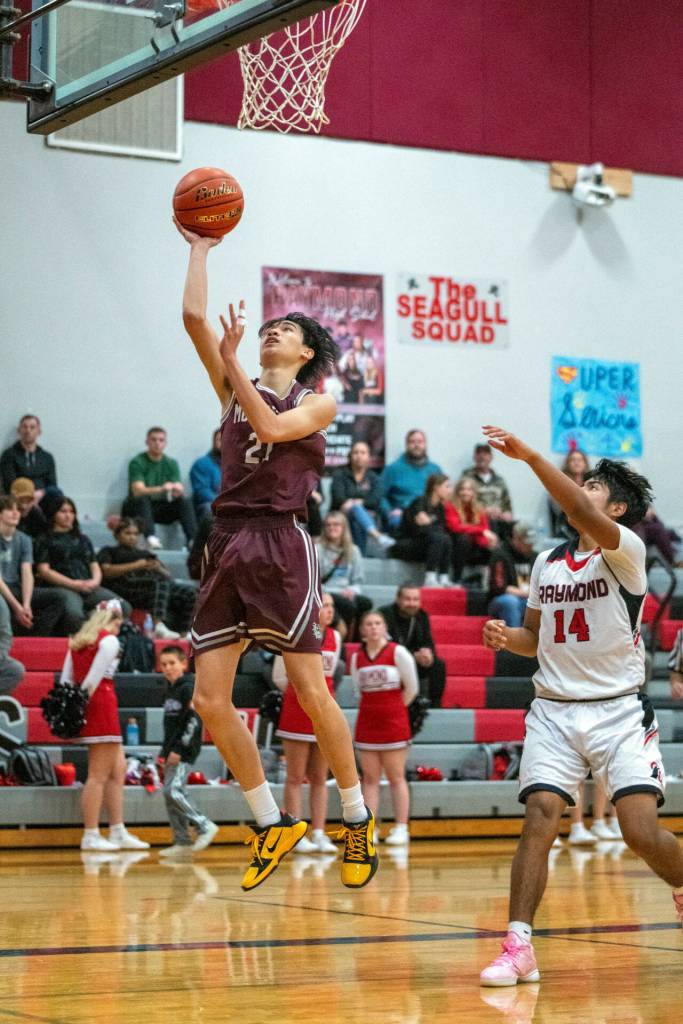 PHOTO BY FOREST WORGUM Montesano guard Delon Chan, left, scores on a layup during a 67-47 win over Raymond on Saturday at Raymond High School. Chan scored 24 points in the victory.