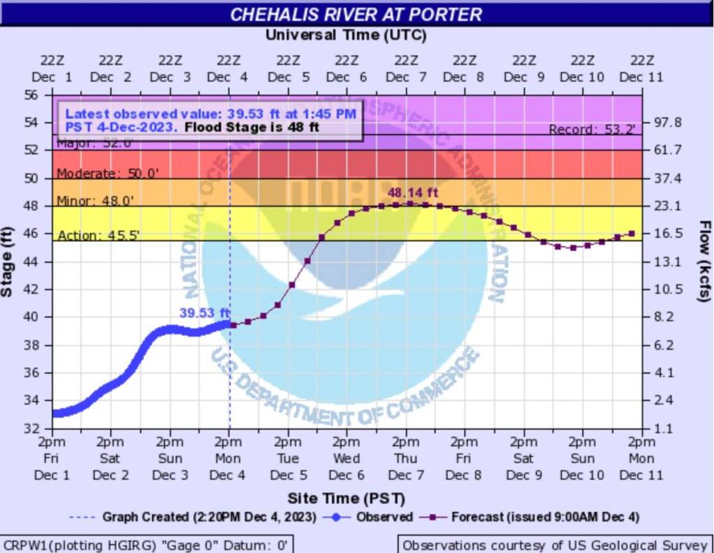 The Chehalis River’s tracking station at Porter has the river on track to hit minor flooding stage on Thursday, said county emergency management program manager Nick Falley in a phone interview.