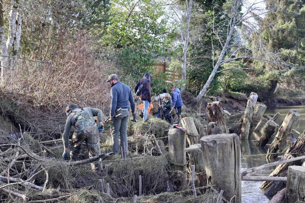 Dozens of volunteers spent Martin Luther King Jr. Day cleaning up and planting more than a thousand Sitka willows on the muddy banks of the Wishkah near Kurt Cobain Memorial Park.