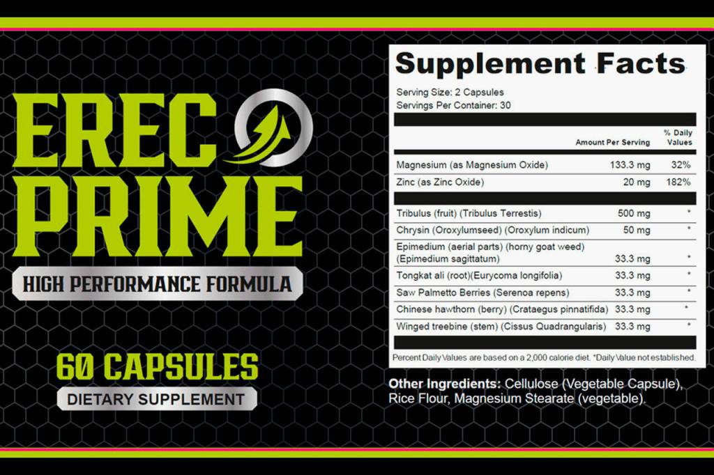 ErecPrime is a sexual health supplement featuring tribulus terrestris, zinc, magnesium, and other ingredients to boost erections.