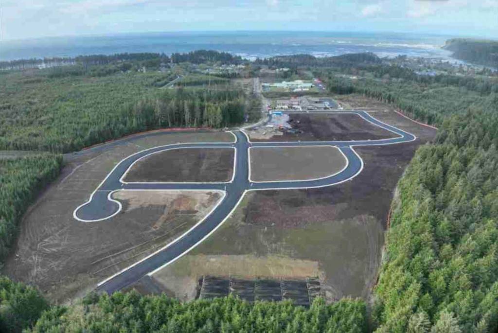 At 150 feet above sea level, the school will be one of the centerpieces of the new upper Taholah village, as the tribe undertakes to move critical infrastructure and neighborhoods a few miles uphill from the current village, which is situated at the mouth of the Quinault River where it enters the Pacific Ocean, at risk to sea-level rise, flooding and tsunami waves. Trees still need to be cleared to make way for the new school alongside freshly platted streets of a future neighborhood.