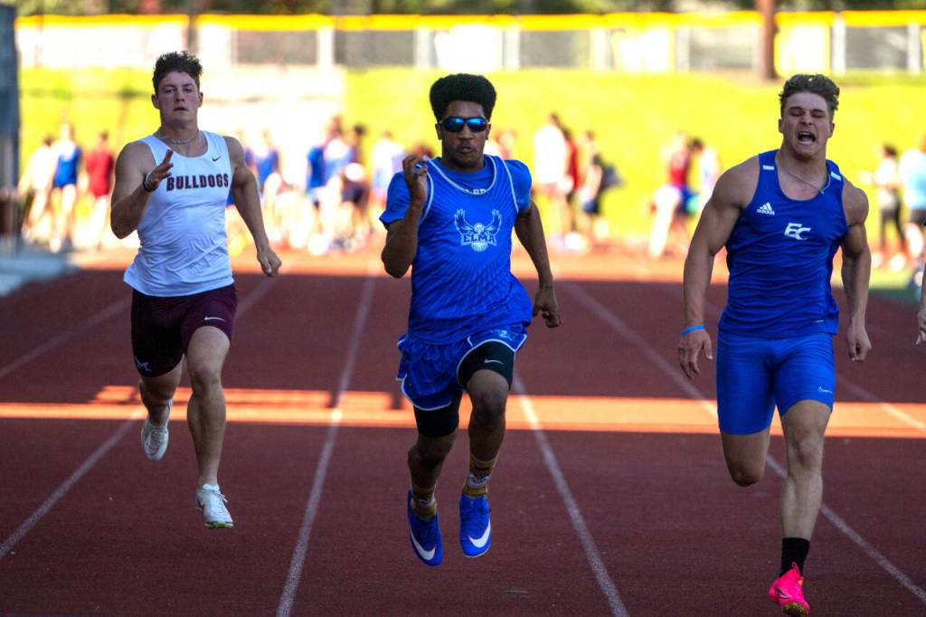100 meters: 1, Elma, Ricardo Guadarrama 11.30 PR. 2, Ky Nation, Eatonville 11.38. 3, Ashton Moore, Tenino 11.52. 4, Peyton Damasiewicz, Montesano 11.61 PR.