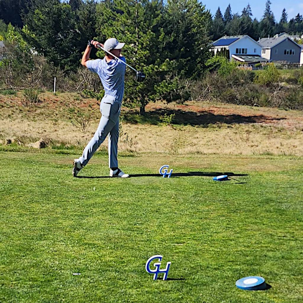 Grays Harbor College golfer Rasmus Tamker tees off during a GHC hosted meet in DuPont in late April. The college decided to suspend the men’s golf and men’s wrestling program on Monday.
