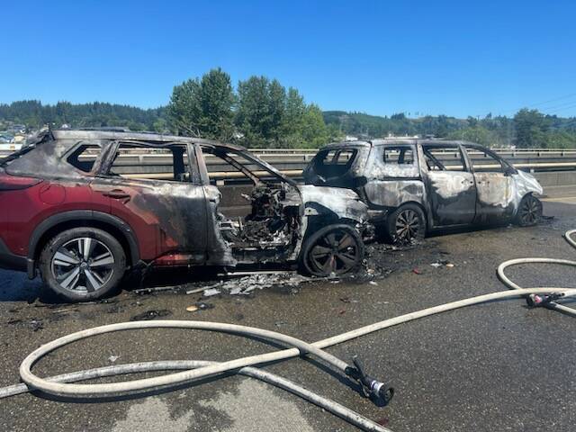The vehicles were extinguished by the Montesano Fire Department, but traffic was blocked for some time.