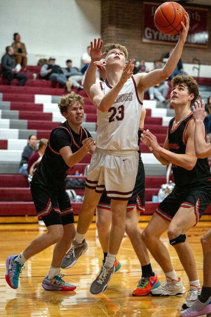 PHOTO BY FOREST WORGUM Montesano’s Caden Grubb (23) scores in the paint during a 56-35 win over Tenino on Thursday in Montesano.