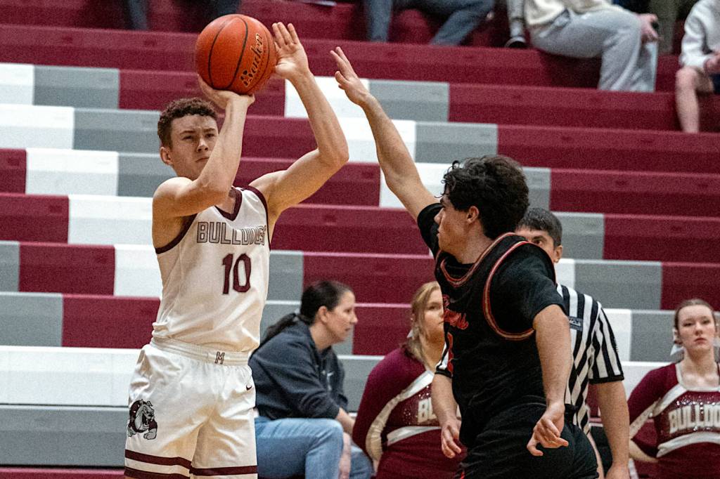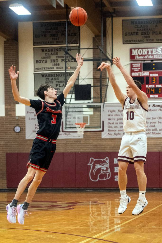 PHOTO BY FOREST WORGUM PHOTO BY FOREST WORGUM Montesano’s Terek Gunter (10) shoots for three against Tenino’s Ashton Moore during a 56-35 victory on Thursday at Montesano High School. Gunter scored a game-high 18 points in the win.