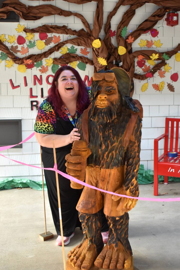 Lincoln Elementary School 5th grade teacher Andrea Andrews poses for a photo with the Bigfoot sculpture commissioned by her father, Jim Andrews.