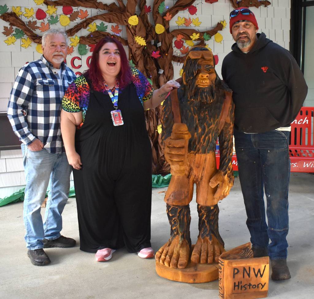 After a few moments and a round of applause from the students, father and daughter removed the tarp revealing an age and culturally appropriate statue of a Sasquatch complete with skateboard, sunglasses and a travel mug. Jim commissioned the sculpture as a Christmas present, but decided to wait and reveal the gift at the school for the benefit of the students.