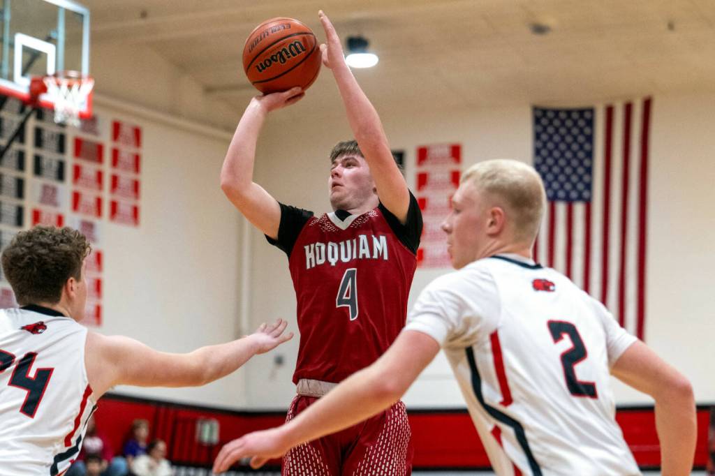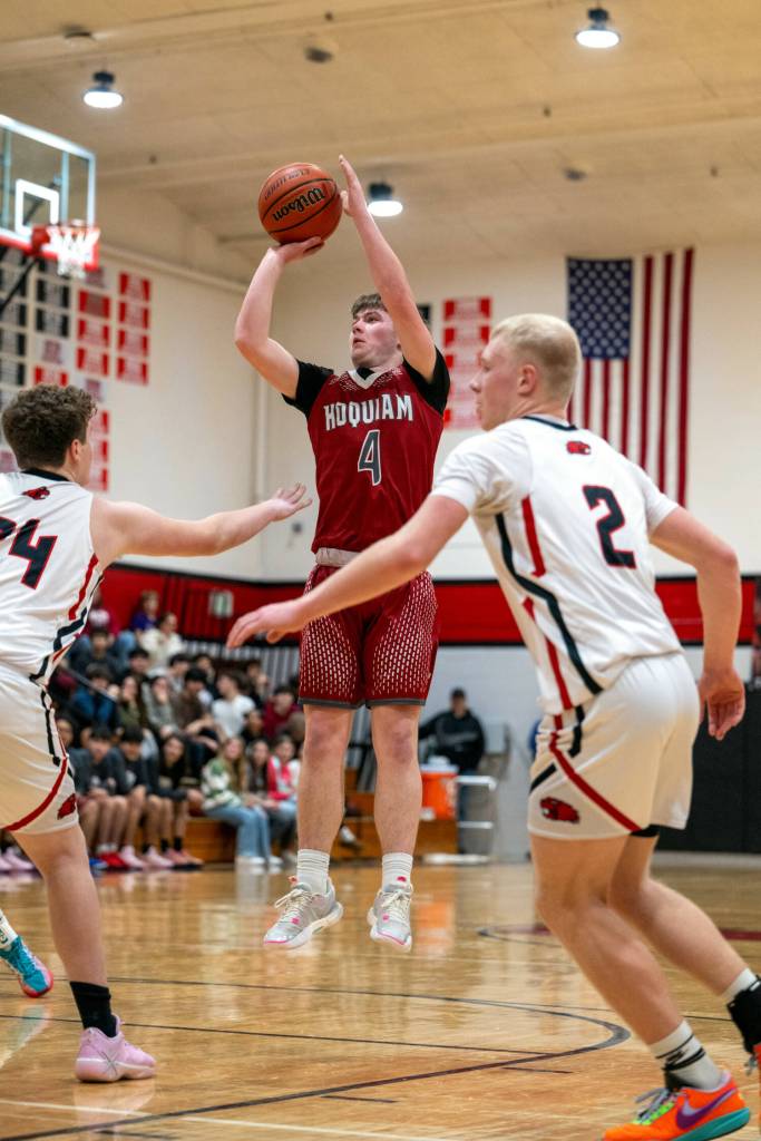 Hoquiam's Joey Bozich (4) puts up a jump shot during a 57-41 loss to Tenino on Friday at Tenino High School.
