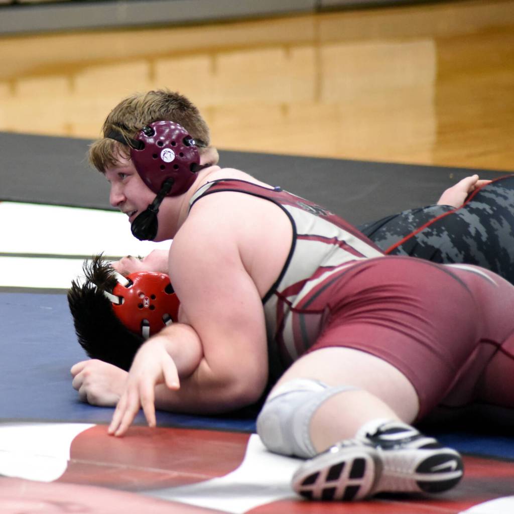 PHOTO BY SUE MICHALAK BUDSBERG Montesano’s Logan Roberts (top) attempts to pin Tenino’s Rowdie Tafoya during the 285-pound final at the Sgt. Justin Norton Memorial Invitational on Saturday at Rainier High School.