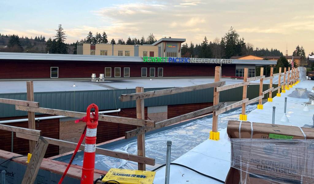 The roof of Summit Pacific Medical Center is almost finished.