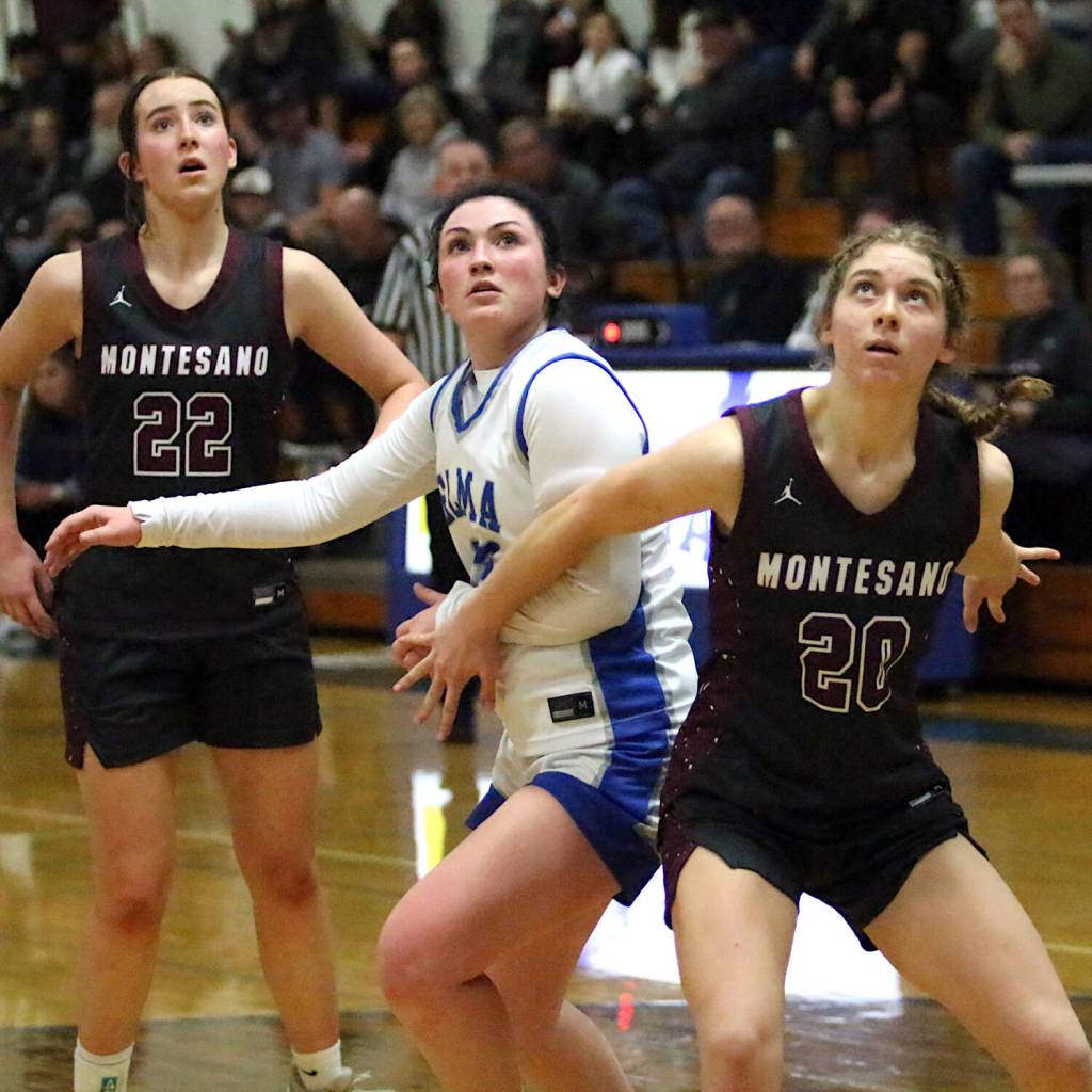 RYAN SPARKS | THE DAILY WORLD Montesano’s Ava Schrader (22), Elma’s Lynsee Bednarik and Montesano’s Hazel Jones (20) ready for a rebound during the Bulldogs’ 40-21 win on Thursday at Elma High School.