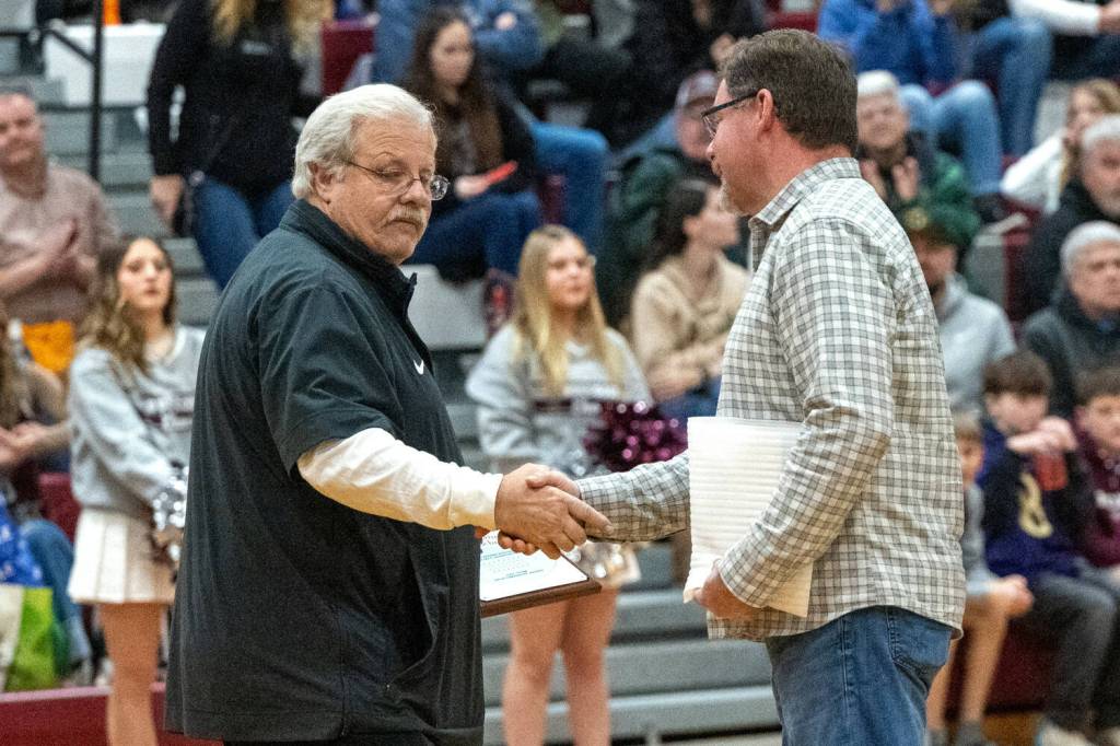 PHOTO BY FOREST WORGUM Montesano head football coach Terry Jensen (left) is congratulated by South Sound Football Officials Association President Jeff Gottlieb during a ceremony on Friday at Montesano High School. The Bulldogs were awarded with the SSFOA’s sportsmanship scholarships for the 2024 season.