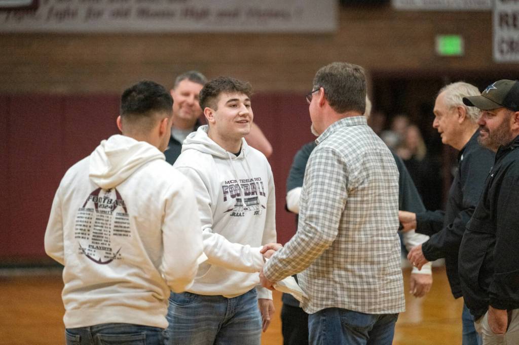 PHOTO BY FOREST WORGUM Montesano senior Felix Romero (middle) shakes hands with South Sound Football Officials Association President Jeff Gottlieb after receiving a scholarship during a ceremony on Friday at Montesano High School.
