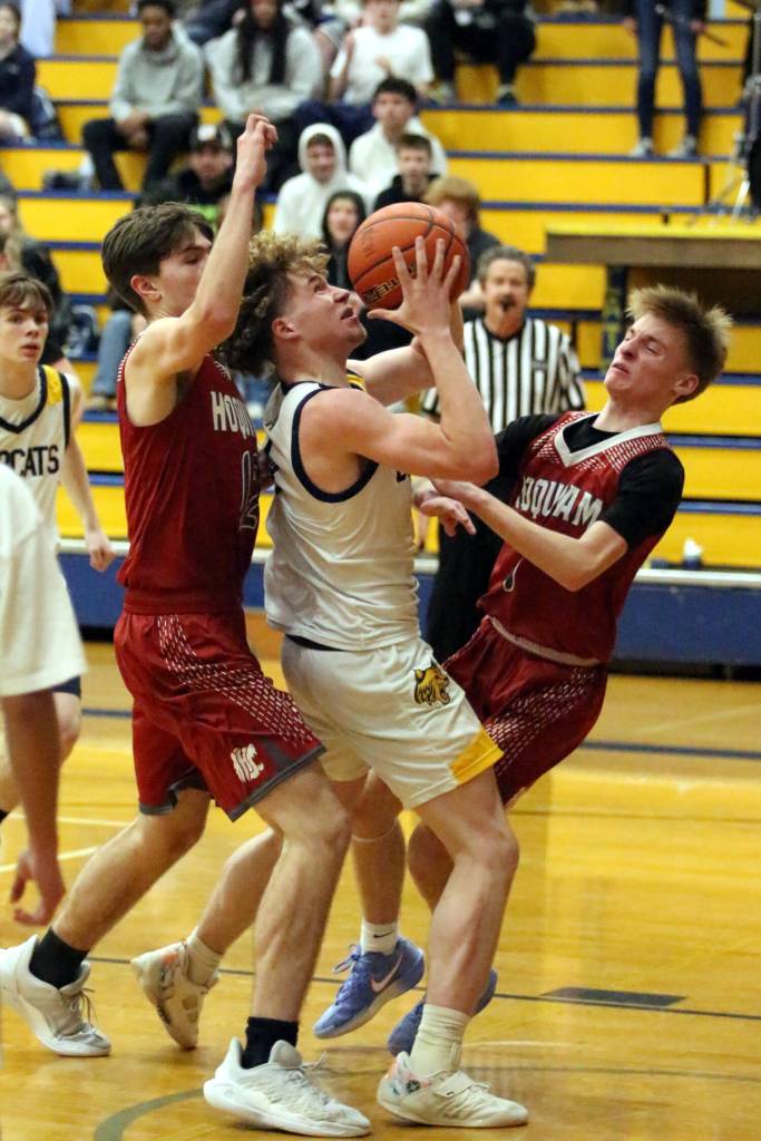 RYAN SPARKS | THE DAILY WORLD Aberdeen’s Tarren Lewis (middle) drives to the basket against Hoquiam’s Tage Dayton (left) and Ryker Maxfield in the Bobcats’ 66-61 victory on Monday in Aberdeen.