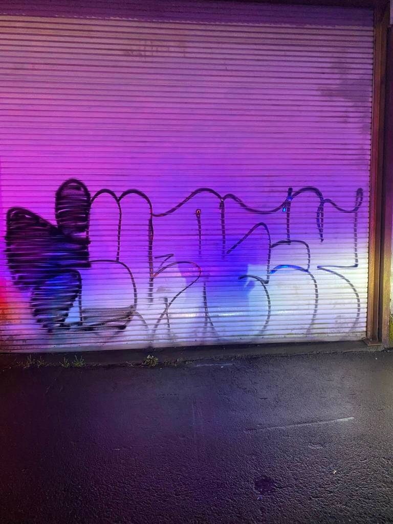 At approximately 1:27 a.m. on February 9, an Aberdeen police officer was on routine patrol with a civilian rider on board. While driving in the 300 block of East Heron Street, the civilian rider saw people spray painting a garage door in the alley.