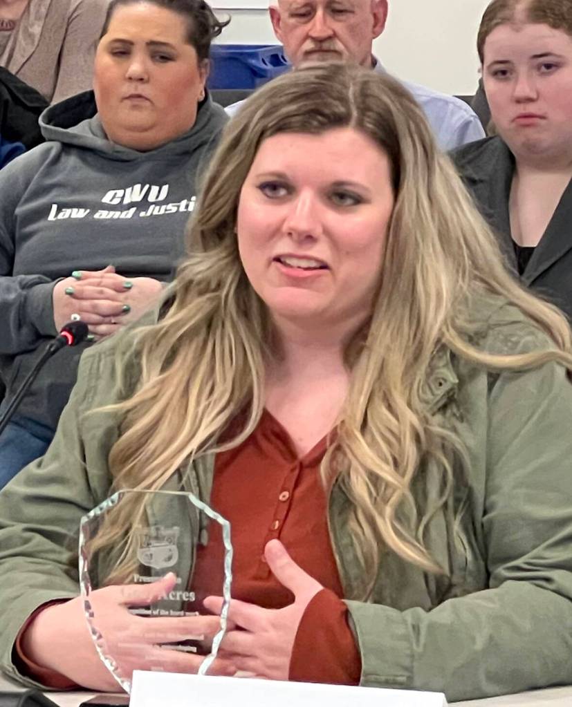 Julie Rajcich accepts an award from the city of Aberdeen on behalf of Gray Acres.