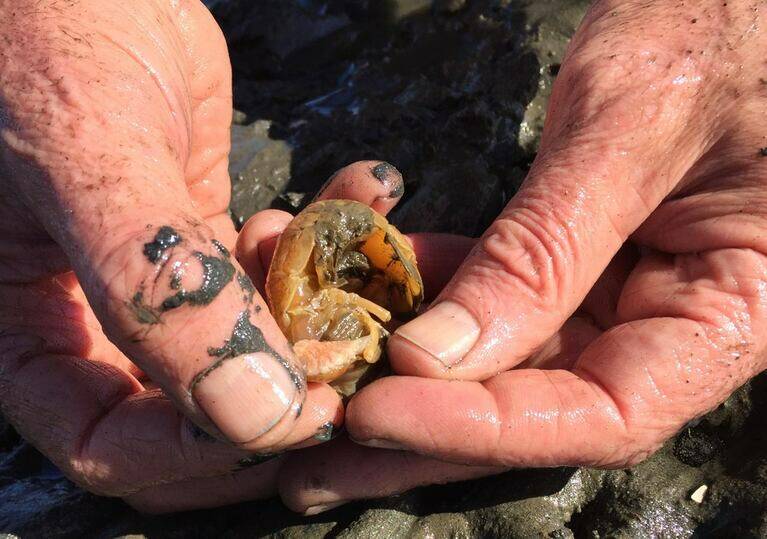The native shrimp are kind of like finger-sized moles of the ocean. They dig tunnels in the tide flats and anything put on top — whether it be an oyster or a rubber-booted shellfish farmer — just sinks into the mud.