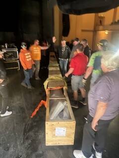 Don Holmes, a project coordinator for Emmert International, quickly organized a volunteer working party consisting of members of ILWU Local 24, and employees from the Aberdeen public works and the parks departments and Rognlin’s, Inc. The volunteers unloaded the semi tractor-trailer by hand and strong-backed the 1,700-pound payload into the theater.