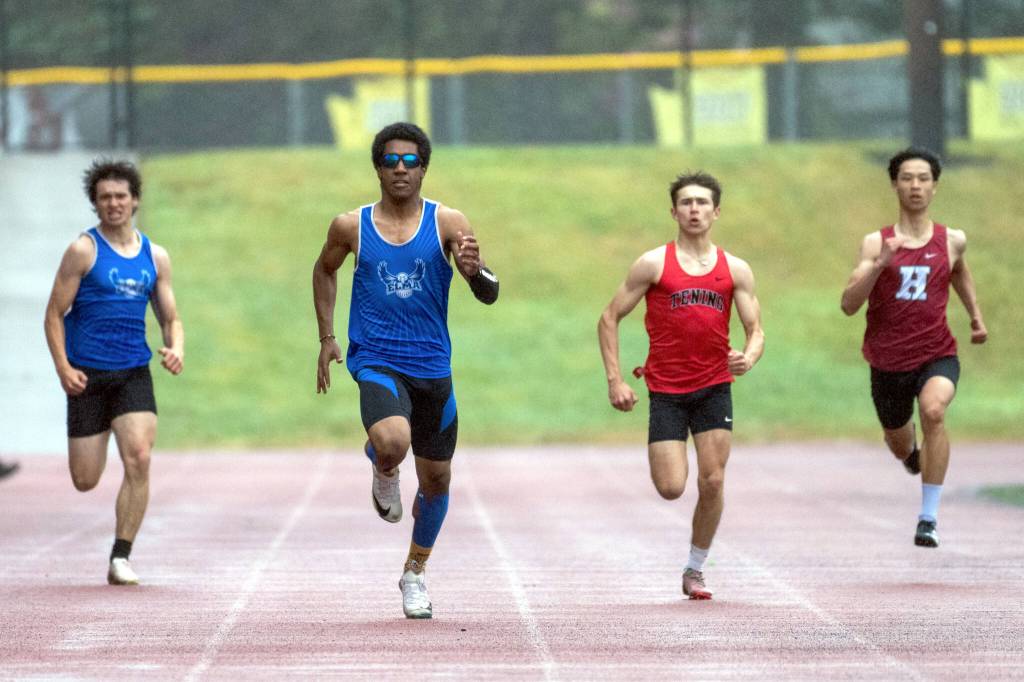 PHOTO BY FOREST WORGUM Elma’s Ricardo Guadarrama (second from left) leads the field in the boys 200-meter sprint at the 1A Evergreen League Championships on Friday at Montesano High School.