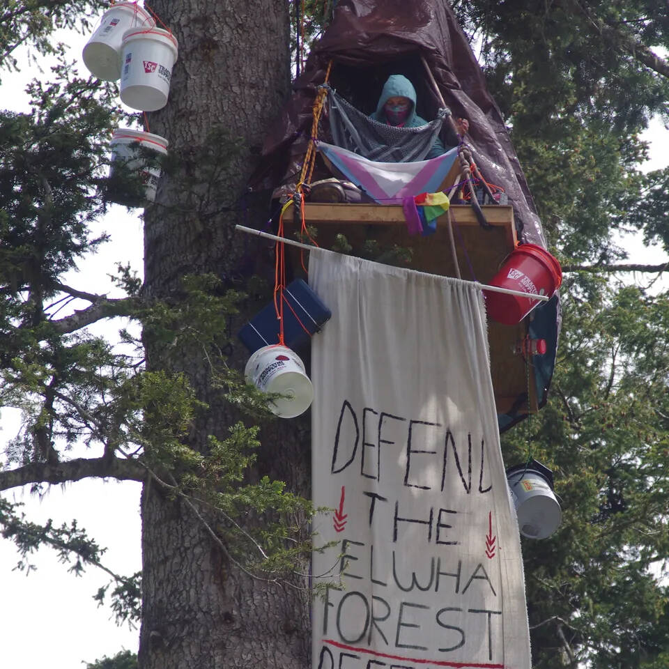 A group calling itself Olympic Forest Defenders has put one of its activists in a tree to block logging of units 3, 4 and 6 of the Parched timber sale near the lower Elwha River on the Olympic Peninsula, approximately two miles southwest of Port Angeles.