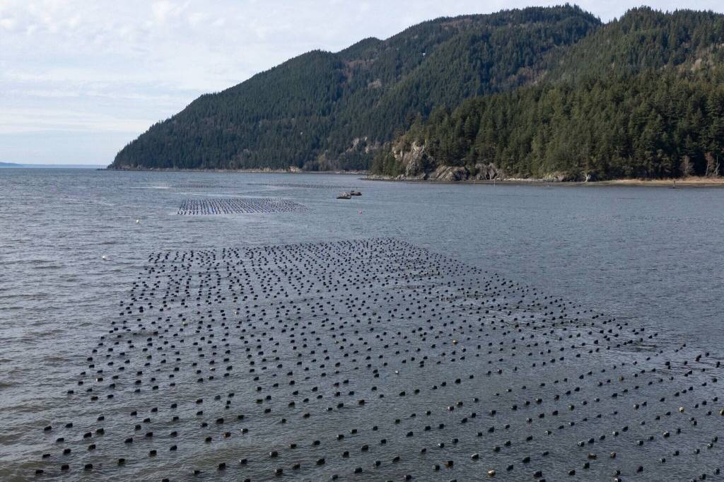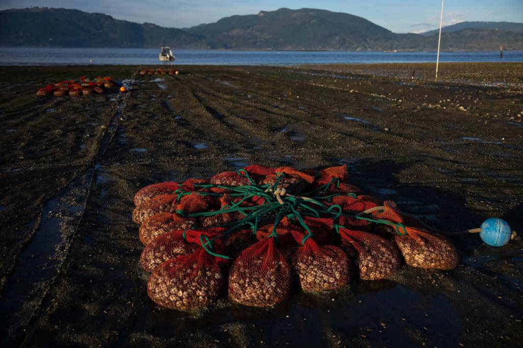 Nets filled with oysters and clams. Nearly all oysters consumed by Americans are farmed. Taylor Shellfish Farms on the Samish Bay near Bellingham, the nation’s largest grower, has a lot at stake.