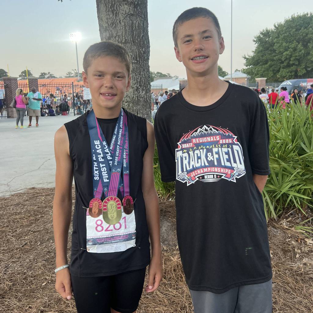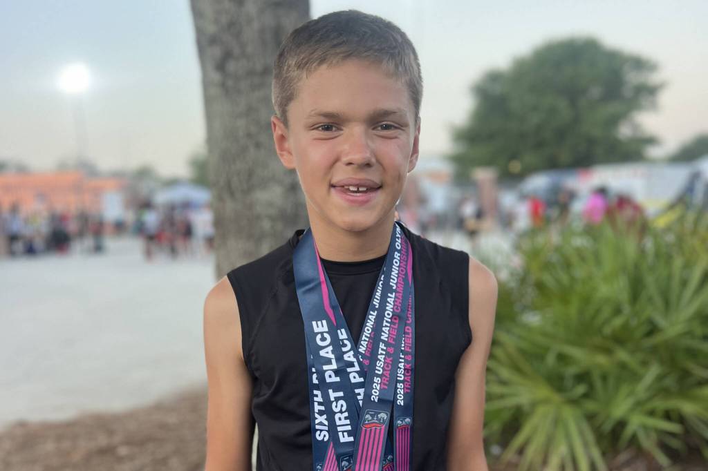 Older brother Brayden Fry also competed at the national championships, placing 24th in the Boys 13-14 triple jump with a personal best of 9.74 meters (31-11.5).