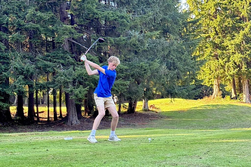SUBMITTED PHOTO Elma’s Trey Yeager shoots off the tee during a match against Hoquiam on Tuesday at the Highland Golf Course in Cosmopolis.