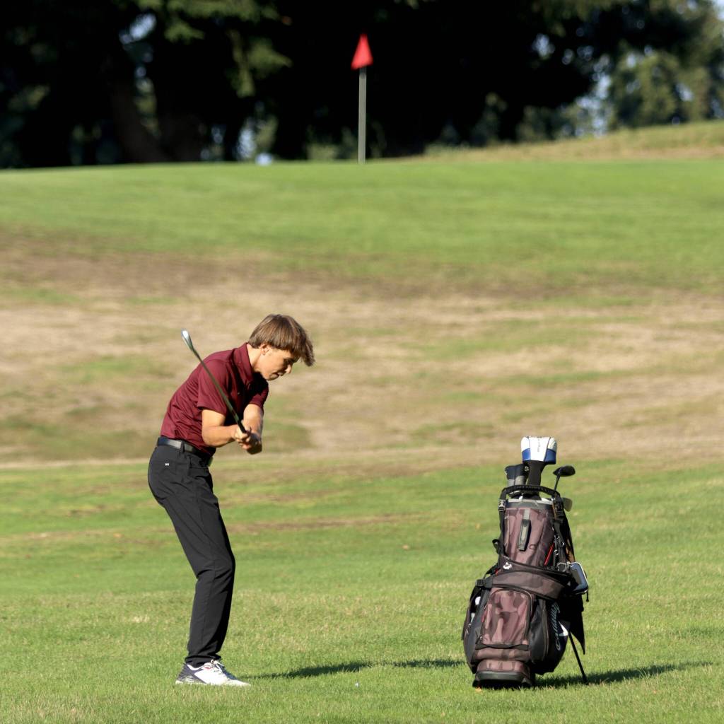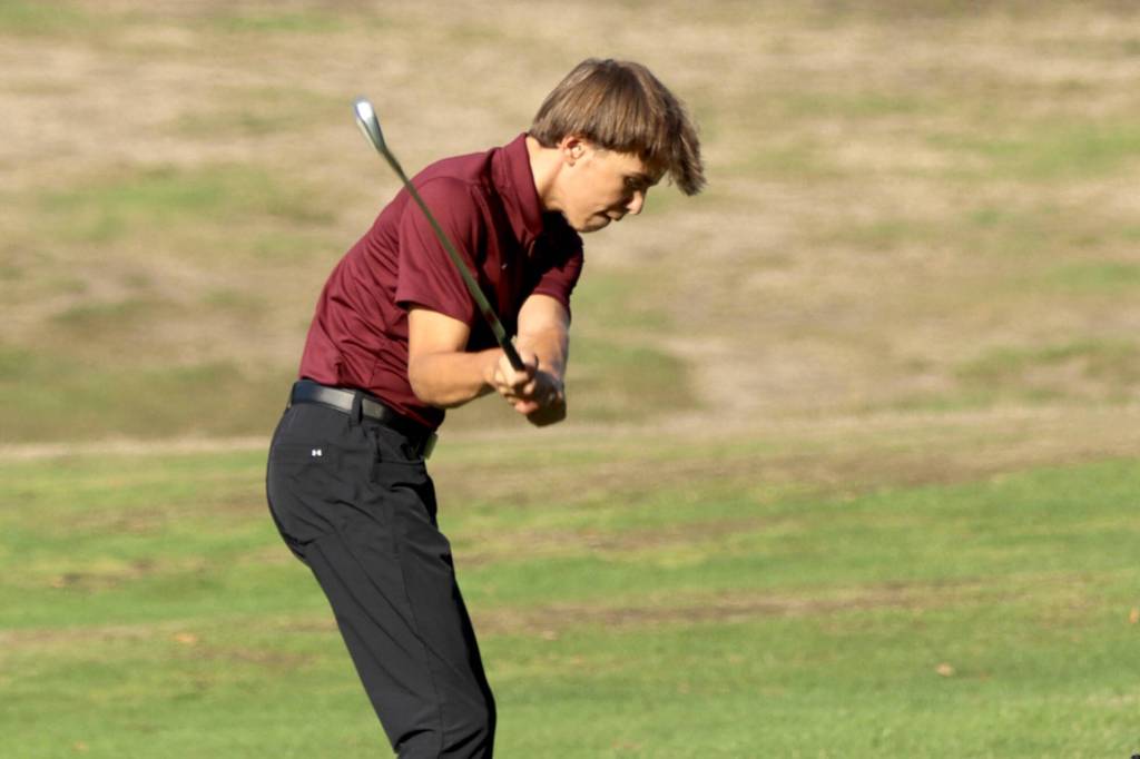 PHOTO BY HAILEY BLANCAS Montesano’s Aaron Black, seen here in a file photo, led the Bulldogs to a victory over Elma on Wednesday at the Oaksridge Golf Course in Elma.