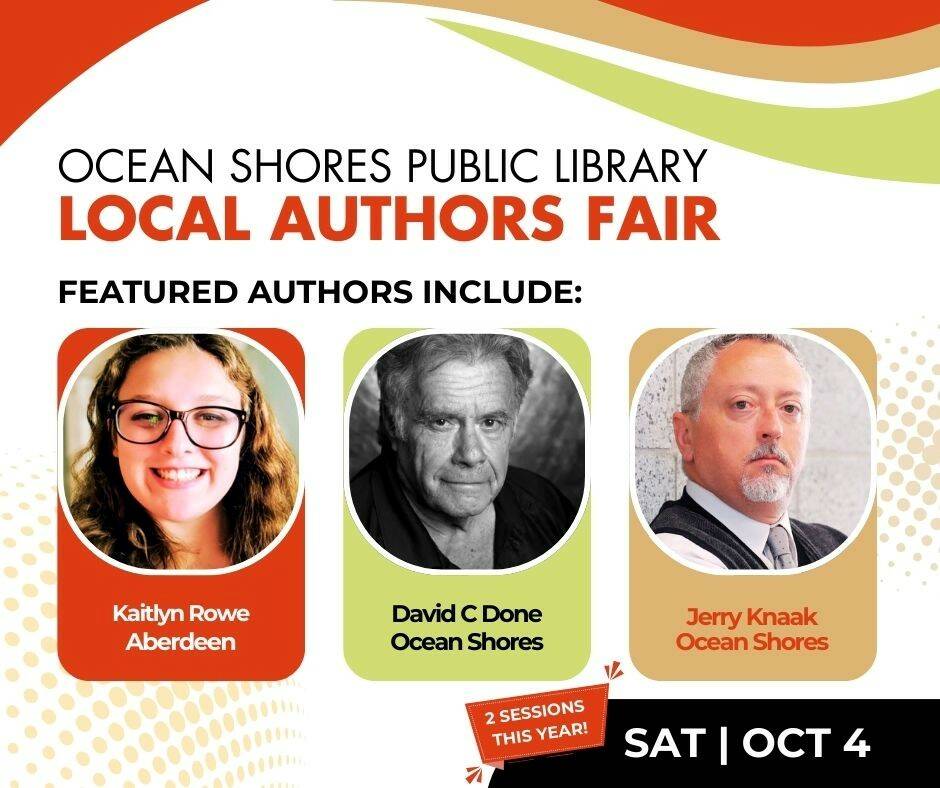 This year the Ocean Shores Public Library Local Authors Fair has two sessions featuring different authors. Drop in anytime Saturday, Oct. 4 between 10 a.m. and noon, and 2 to 4 p.m..