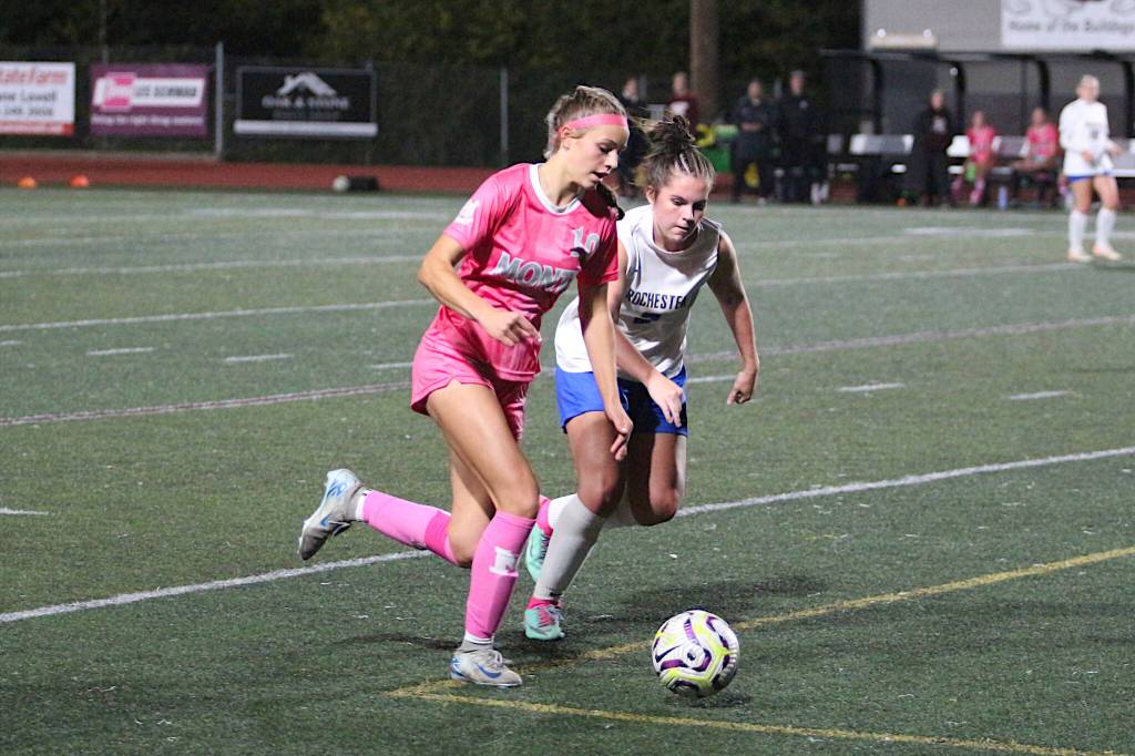 RYAN SPARKS | THE DAILY WORLD Montesano forward Lex Stanfield (left) works the ball up the field against Rochester’s Chloe Hess during the Bulldogs’ 8-0 win on Thursday at Montesano High School.