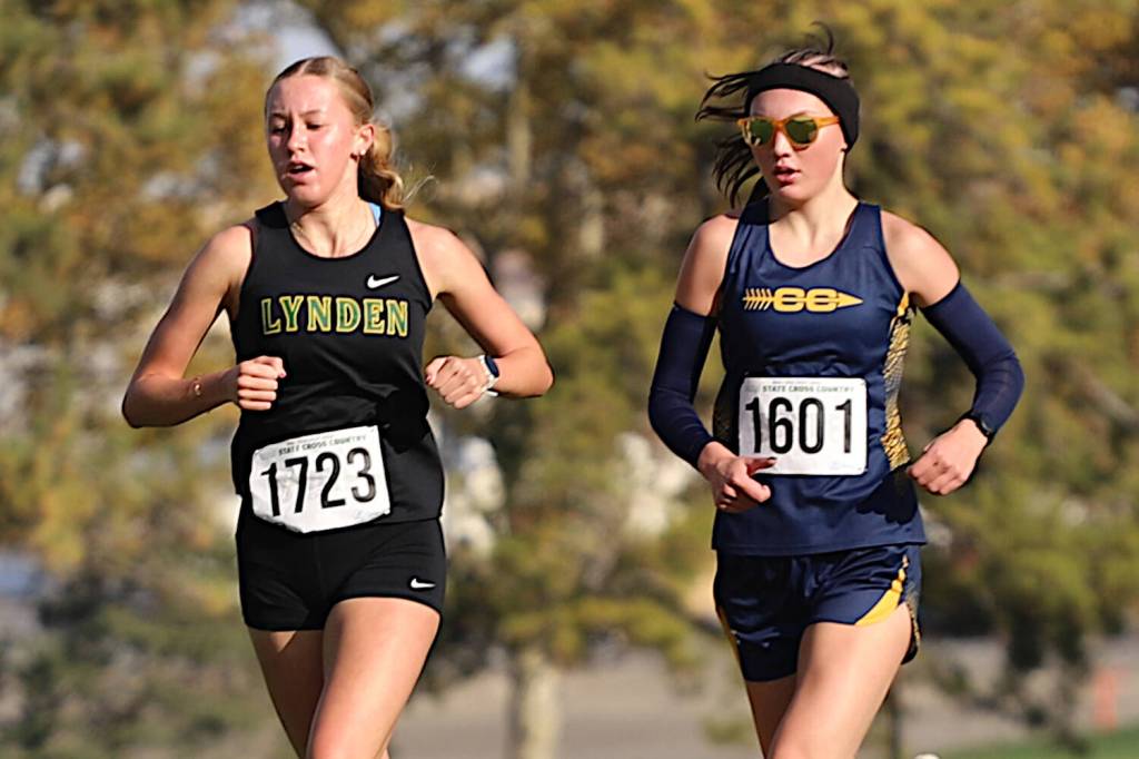 PHOTO BY DENNIS NELSON Aberdeen’s Ailyn Haggard (right) keeps pace with Lynden’s Wren Dickson during the WIAA 2A Girls State Championship cross-country race on Saturday at the Sun Willows Golf Course in Pasco. Haggard placed eighth overall to earn all-state honors.
