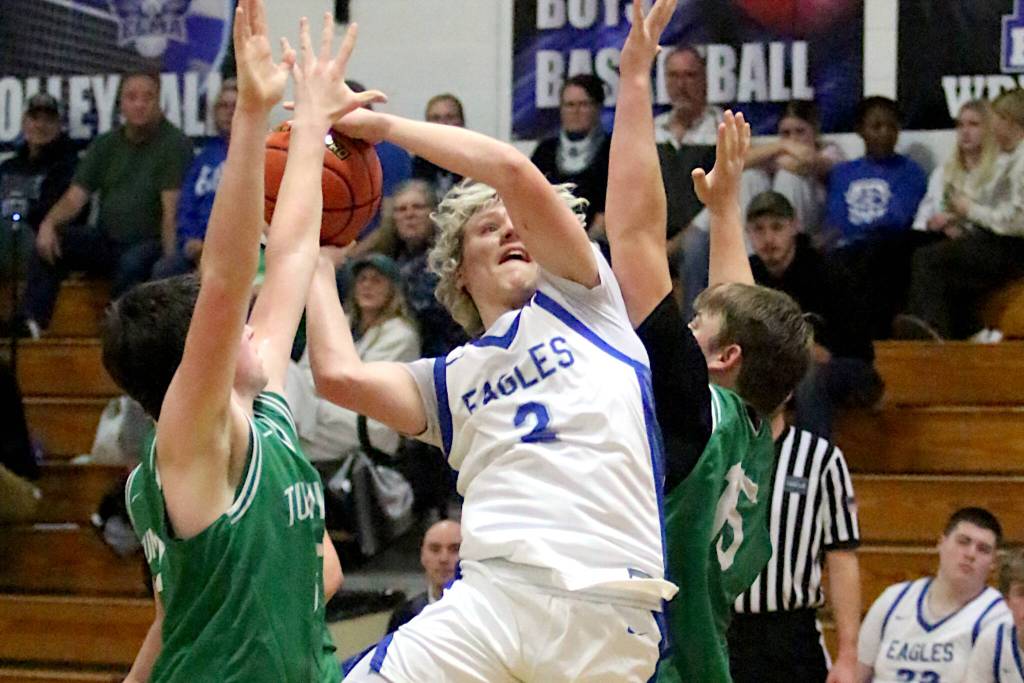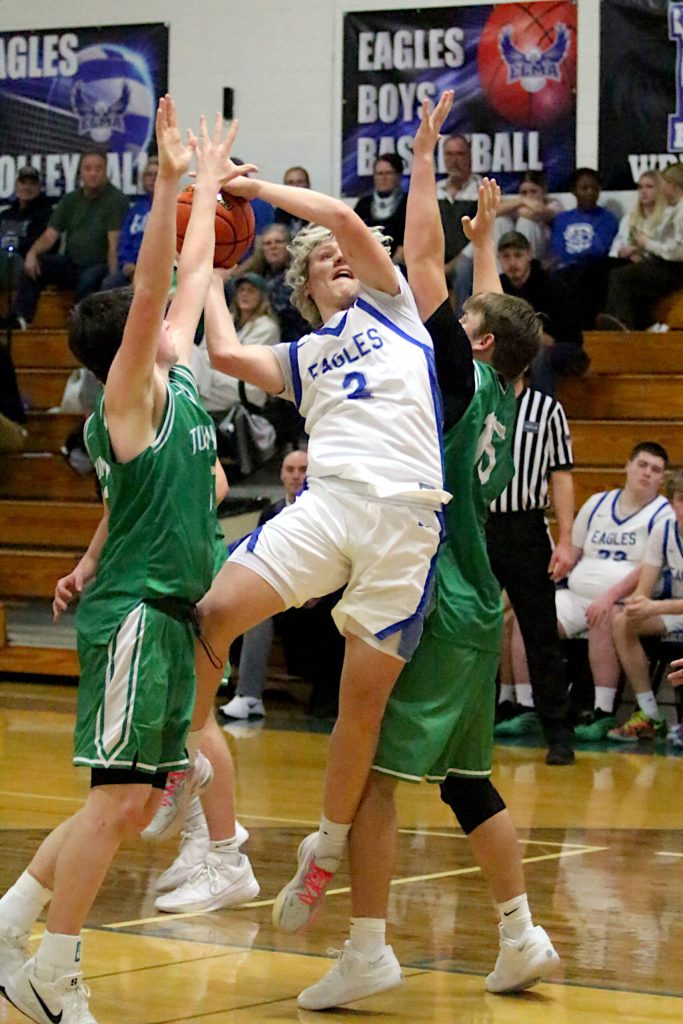 But the bigger T-Birds – whose outside shooting had gone ice cold in the second half – pounded the ball inside, scoring on four straight possessions from inside the paint to take a 52-36 lead, forcing an Elma timeout with 3:22 on the clock.