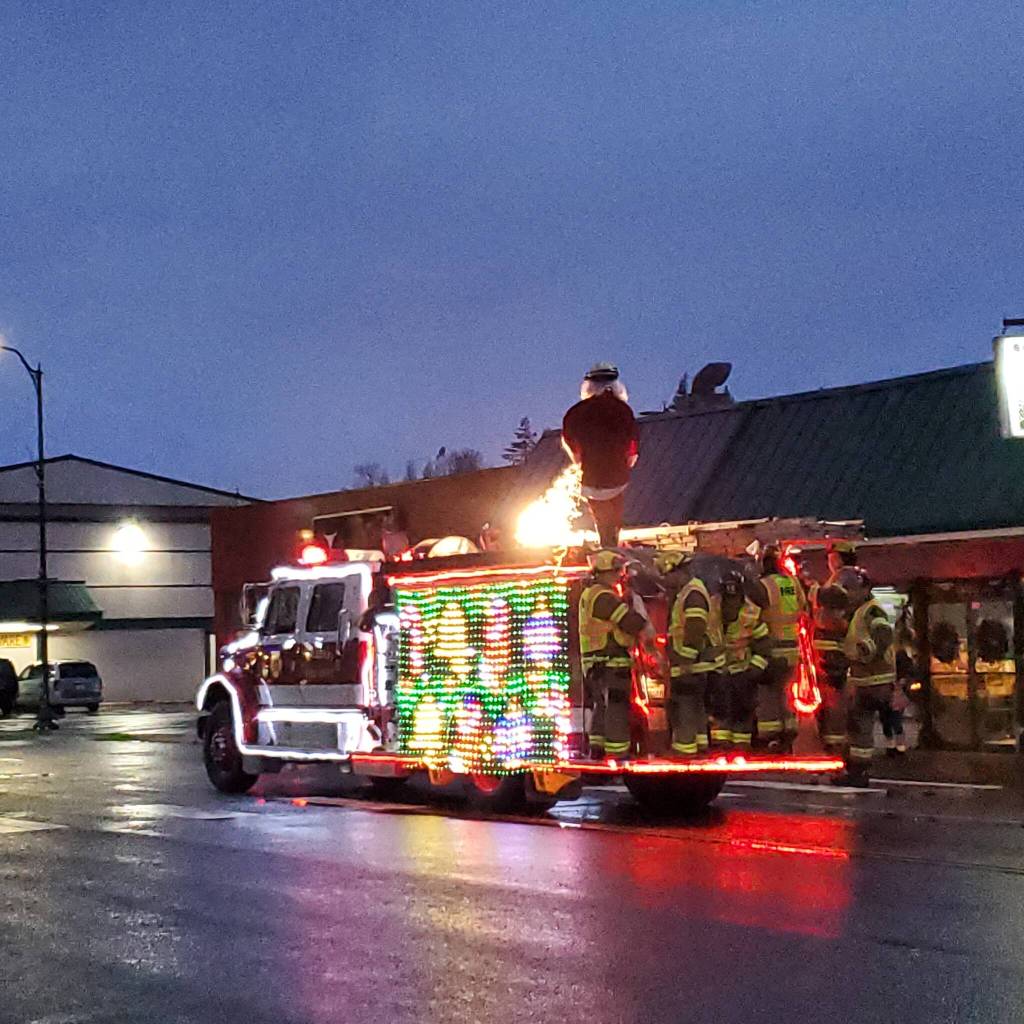On late Saturday afternoon and into the evening, McCleary firefighters escorted Santa on their annual Santa Through Town Food Drive. In spite of the frequent downpours, residents came out to hand over bags of donations to the firefighters who walked ahead of the firetruck. A caravan of vehicles trailed after Santa to collected the donations, and trips to the station were needed to unload. In all, it took five hours to go through the entire town.