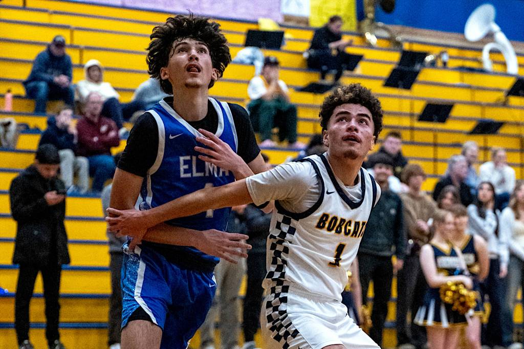 PHOTO BY FOREST WORGUM Elma’s Trayton Webb (left) and Aberdeen’s Isaac Garcia compete for a rebound during the Eagles’ 68-66 win on Tuesday at Aberdeen High School.