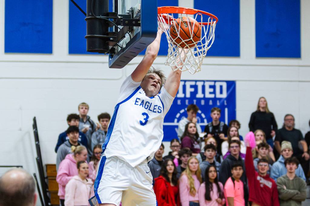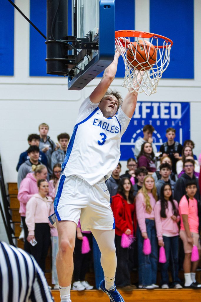 In front of a packed Elma Gymnasium, the Eagles (9-4 overall, 3-1 1A Evergreen) scored the first eight points of the game, culminating with a breakaway slam dunk from senior star forward Isaac McGaffey at the 3:32 mark.