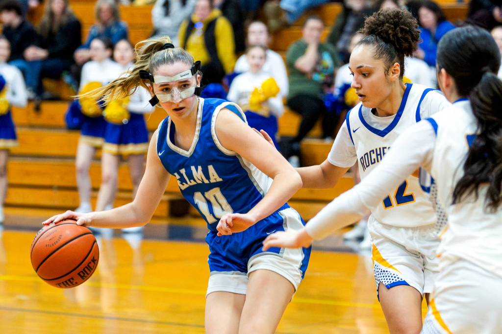 Scoring: Elma – Roberts 17, Moore 9, Vest 5, Carter 4, Tolentino 3, Monroe 3, Smith 3, Gonzales 3, Skeem 2, Heley 2. Rochester – Dupont 16, Rodriguez 6, Wilkins 5, Kesting 2, Estrada 1.