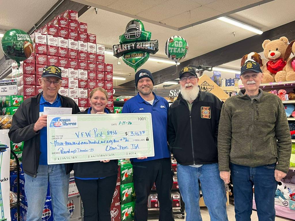 Thanks to the Ocean Shores IGA customers who rounded up their purchases during December, Ocean Shores IGA presented a check for $3,963.80 to North Beach VFW Post 8956, which serves Ocean Shores and the surrounding coastal communities.