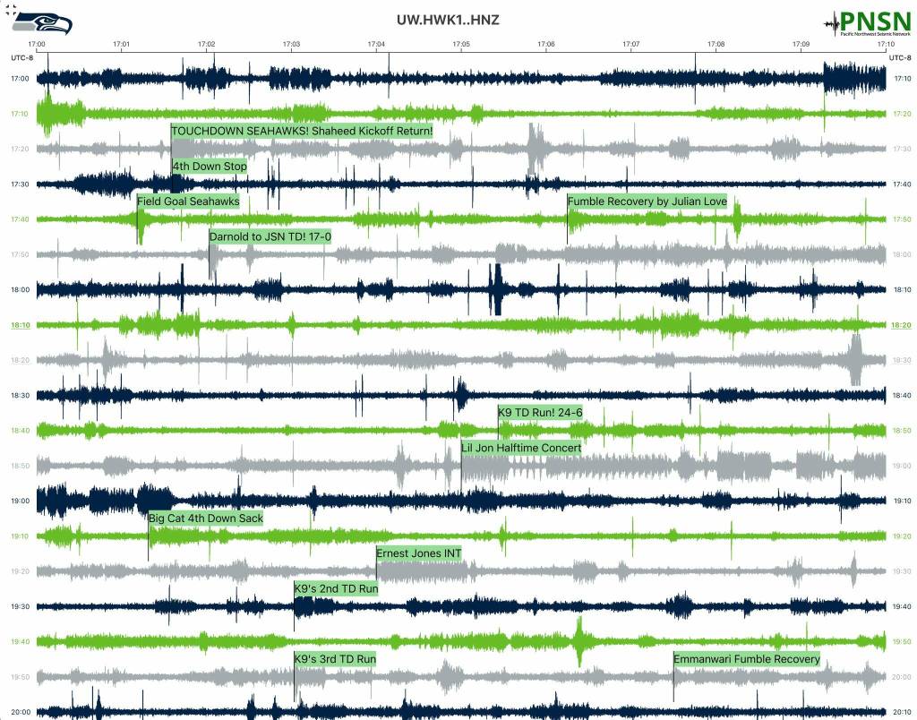 Prior to the Seahawks game on Jan. 17, the Pacific Northwest Seismic Network (PNSN) installed six stations throughout Lumen Field to capture the seismic energy produced by the collective movement of the 12s during the 2026 NFL Playoffs.