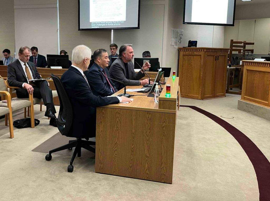 Let’s Go Washington leader Brian Heywood, far end of table, testifies before the state Senate’s State Government, Tribal Affairs and Elections Committee on Jan. 20, 2026. Center is Secretary of State Steve Hobbs. Next to Hobbs is former Secretary of State Sam Reed. All three testified against Senate Bill 5973, which would impose new restrictions on the initiative process.